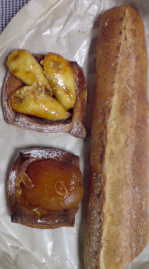 ミニクロワッサン、デニッシュ、メロンパン、クリームパンの菓子パン系と、石窯で焼いているということなのでハード系を一つ購入。