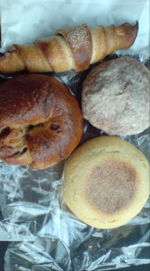 ヴィーガンクロワッサン、イングリッシュマフィン、シナモンレーズンベーグル、杏のジャムパンを購入。