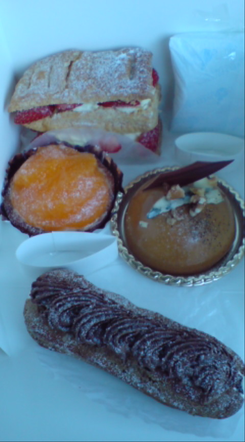 今回はテイクアウトで、買ったのは、清見のオレンジタルト、エクレールショコラ、ミルフィーユ、アールブルー。