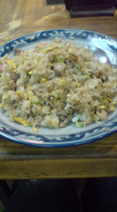 出てきたチャーハンはオタマで固めていないチャーハン。色はオイラ好みの茶色っぽいやつで、大きめに角切りされた肉がたっぷり。肉は若干硬めでしたが問題ないレベル。チャーハン自体の味付けも良い。量は多すぎる位です。