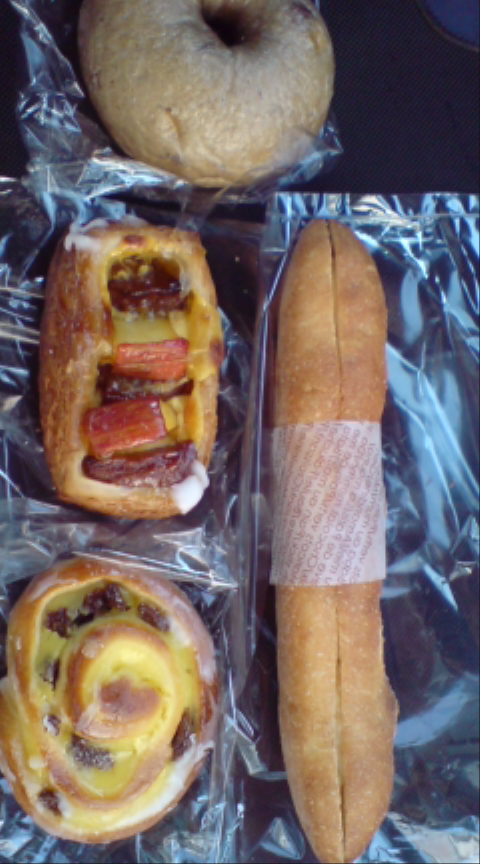 買ったのは、必ず買うミエーレ、パン・オ・オリーブ、シナモンベーグル、ハニーマスタードチキンサンド、クリームパン、デニッシュオランジュ。
