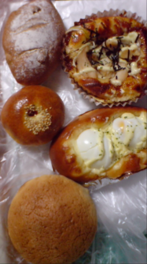 昼飯もまだだし惣菜パンも欲しいな。んで購入したのは蒸し鶏とたまねぎとマヨネーズのパン、タルタルタマゴパン、こしあんぱん、メープルメロン、くるみクリームチーズパン。